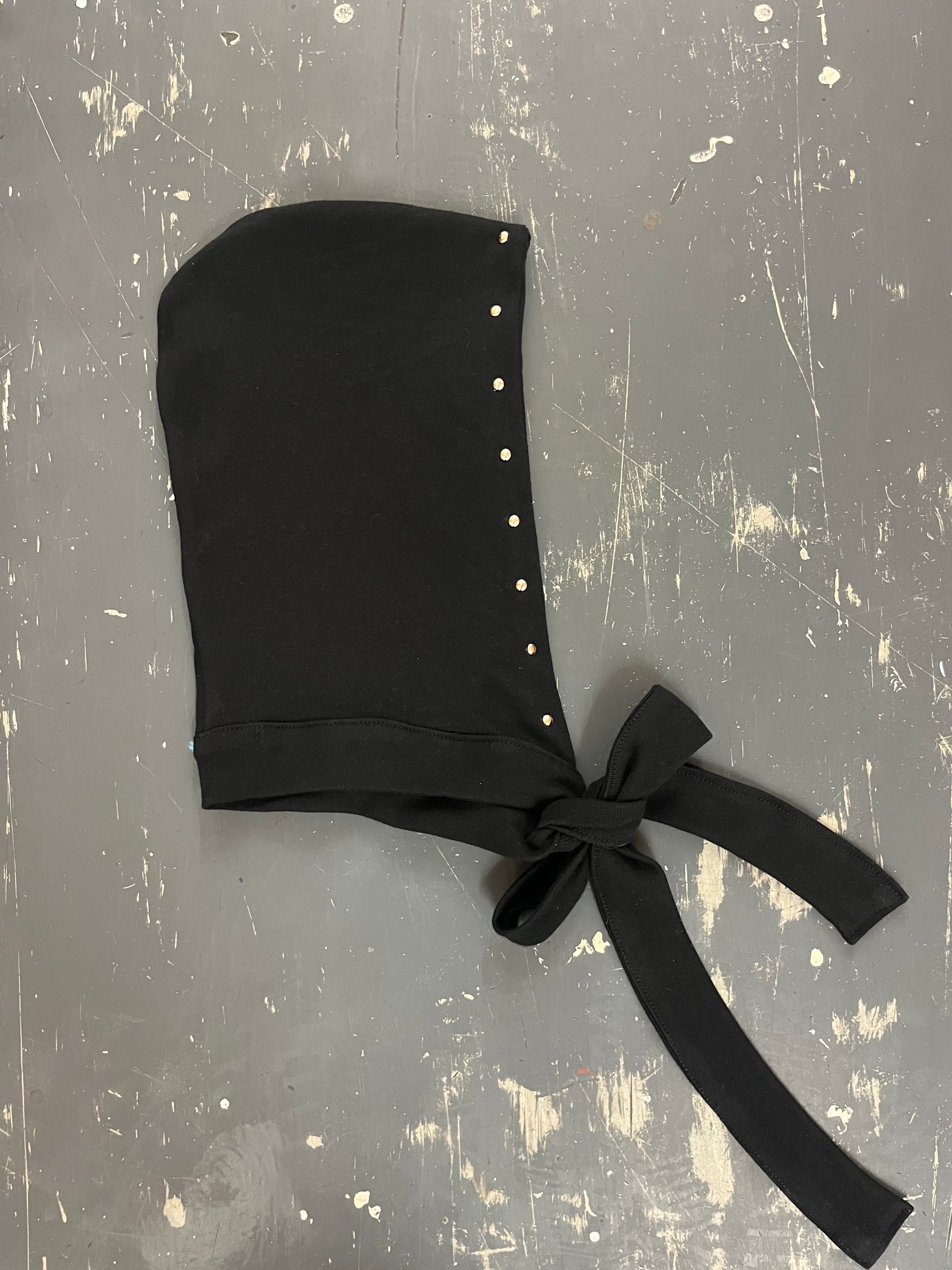Handmade by me in my studio in East London using dead stock jersey fabric, featuring a silver studded edge. Guaranteed to keep your ears cosy in the cold weather!