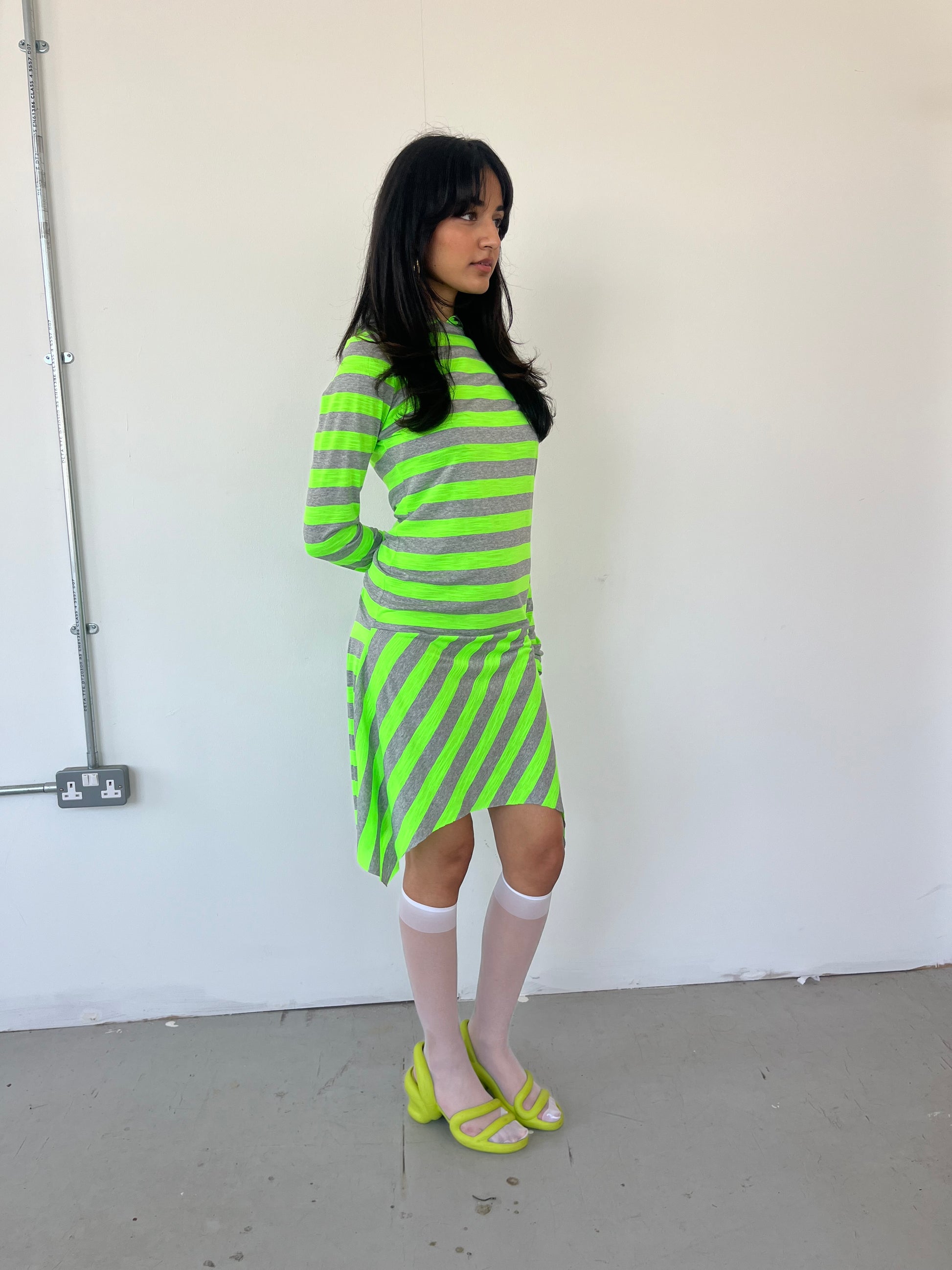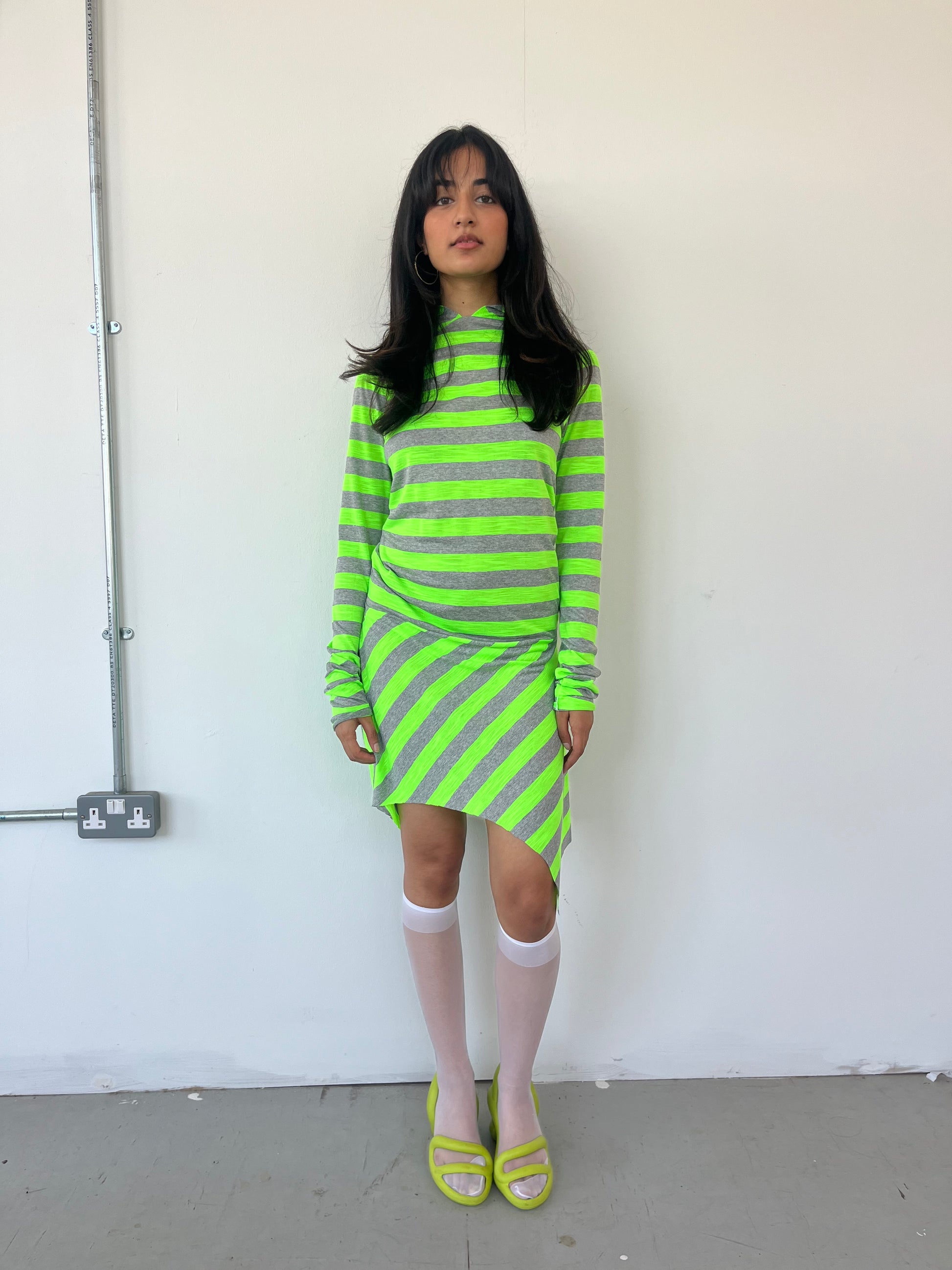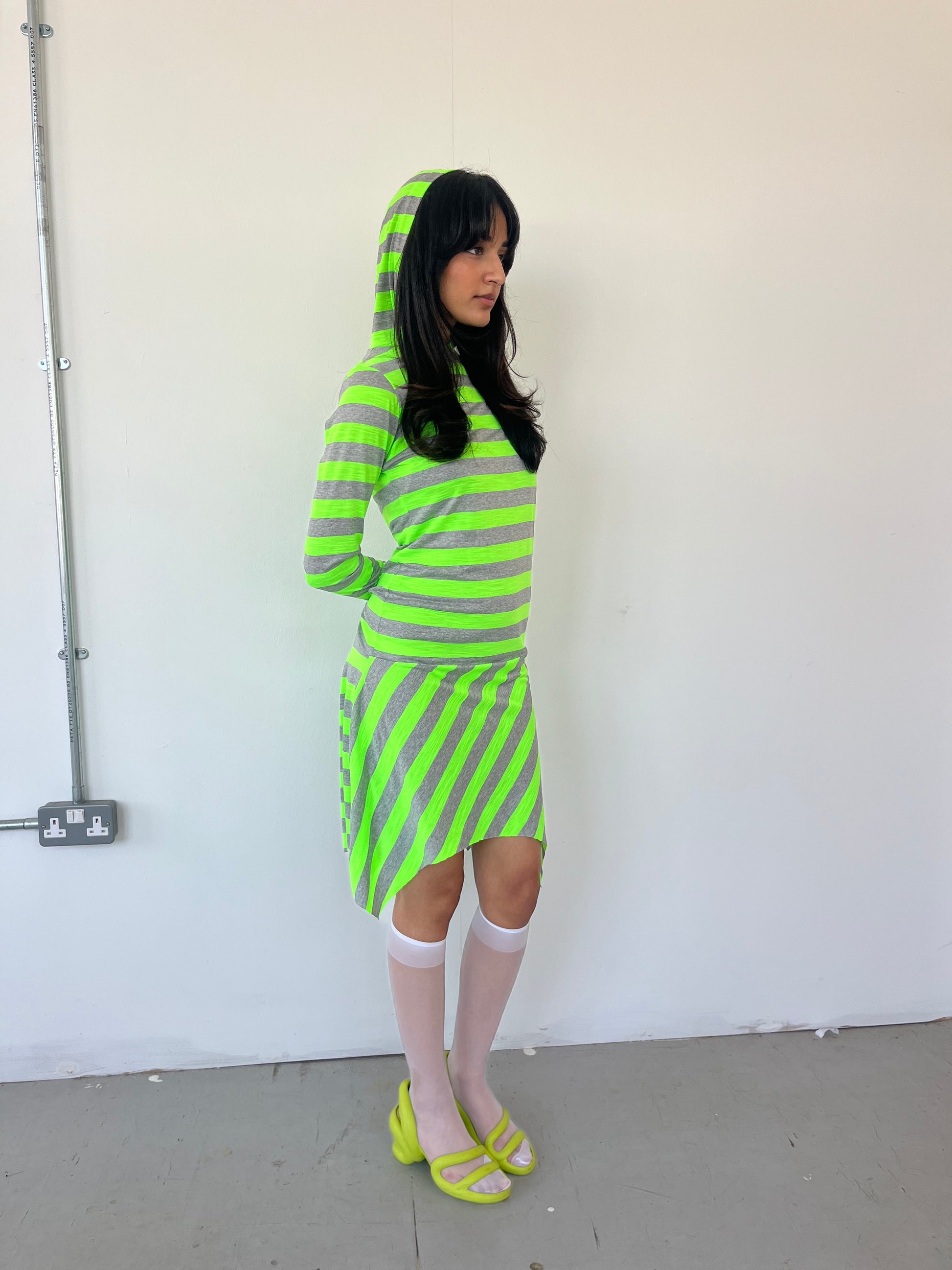 Green and Grey stripe dress with asymmetric hem line. Features a hood and dropped waist line. Made with lightweight dead stock jersey fabric.
